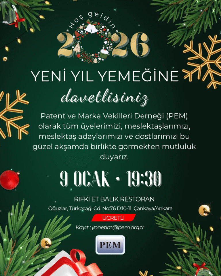 Değerli Meslektaşlarımız ve Meslektaş Adaylarımız, Patent ve Marka Vekilleri Derneği (PEM) olarak tüm üyelerimiz, meslektaşlarımız ve meslektaş adaylarımız ile dostlarımızın katılımına açık MÜZİKLİ VE EĞLENCELİ YENİ […]